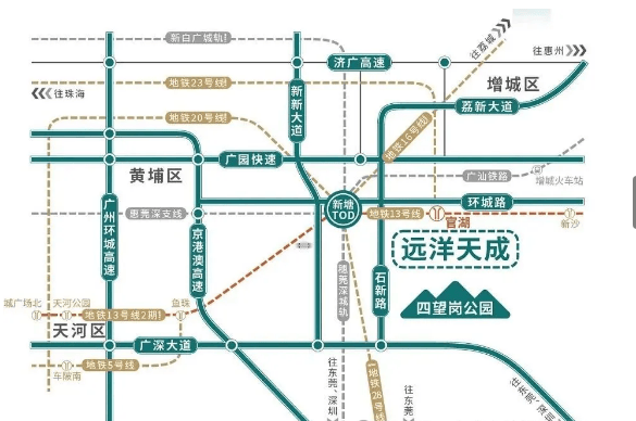项目交通优势体现在 “近地铁 + 邻 TOD” 的双重布局。距离地铁 13 号线 分钟即可到达,搭乘 13 号线可快速衔接黄埔、天河等核心区域,实测早高峰通勤便捷性突出。更值得关注的是,项目邻近新塘 TOD,这里规划打造 10 轨交汇的国际枢纽,涵盖 5 条地铁、3 条铁路及 2 条城际轨道,未来可实现 3 分钟零换乘,25 分钟直达广州东,30 分钟通达白云机场,53 分钟直达深圳宝安机场,甚至可通过延长线 小时大湾区生活圈。