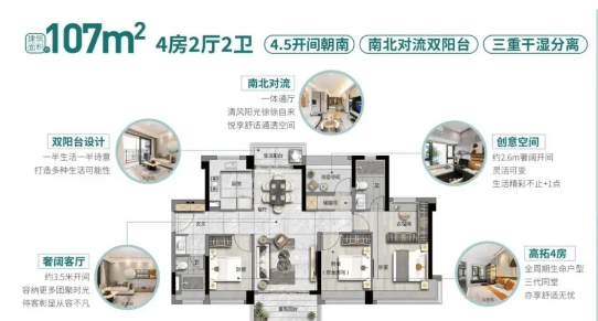 107㎡四房两卫户型则适配刚改家庭,南北对流双阳台设计,通风效果极佳,客厅开间宽敞,主卧带独立卫浴与衣帽间,无论是多孩家庭还是三代同堂,都能拥有舒适的居住空间,总价 155-165 万即可入手,性价比优势显著。