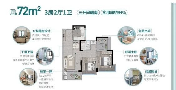 户型设计是远洋天成的 “王牌优势”,主打 69-124㎡三至四房,得房率高达 93.6%,远超同板块刚需项目平均水平,部分户型还带有赠送面积,进一步提升空间性价比。其中 82-84㎡三房两卫户型堪称经典,做到南北通透、四开间朝南,客厅与卧室均能获得充足采光,动静分区合理,厨房连接生活阳台,收纳与实用功能兼备,113-122 万的总价更是直击刚需痛点。