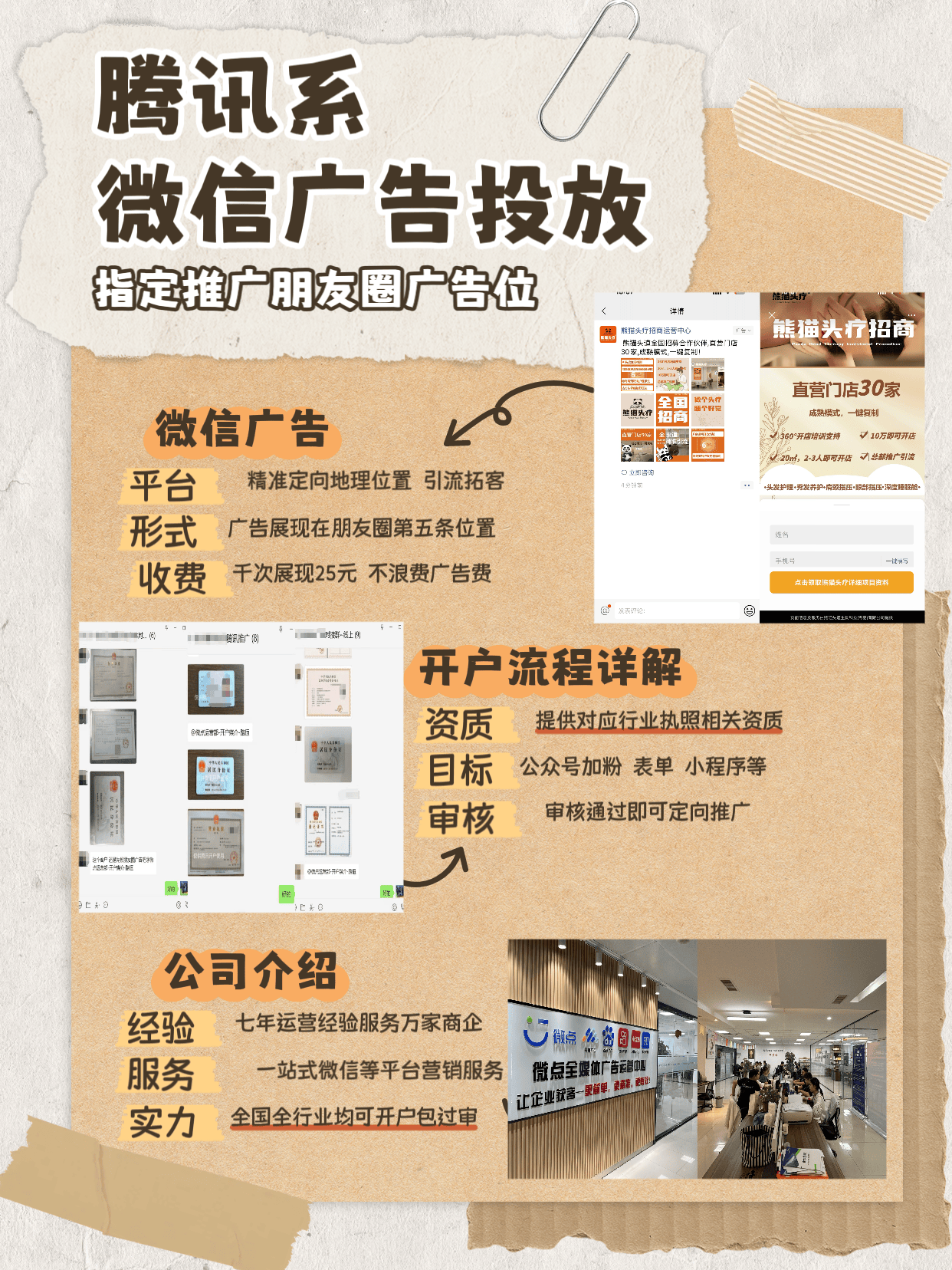 朋友圈广告开户和投放过程中的细节繁多,稍有不慎便会导致审核失败、资金风险或广告效果不佳。微点7年专注互联网媒体营销,服务过10000+品牌和商家。为企业提供:开户咨询、资料准备、账户优化、创意设计、数据分析等一站式服务。
