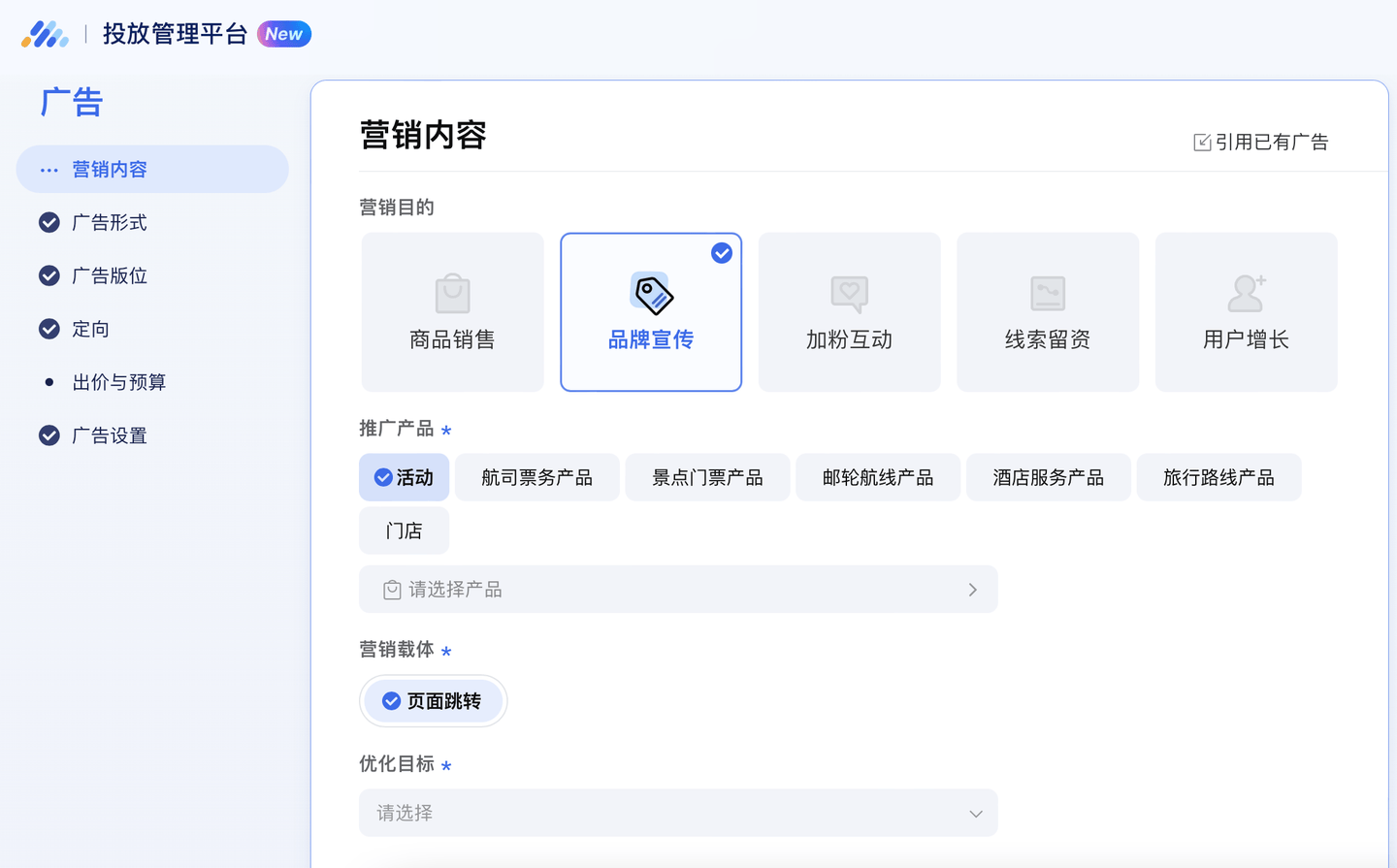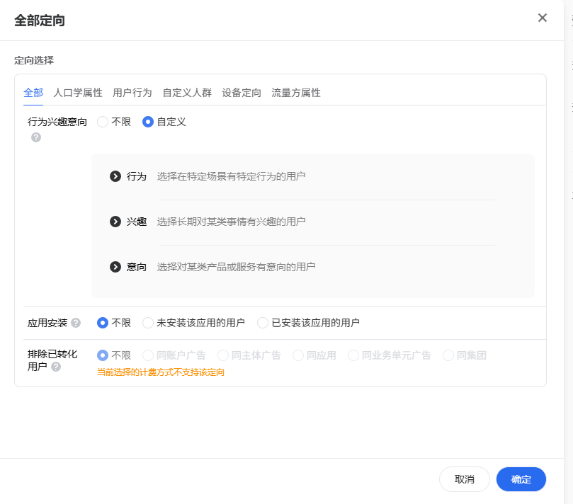 在腾讯广告后台创建计划时需明确:推广目标:选择品牌曝光、公众号涨粉、商品销售等目标。