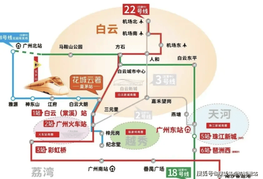 项目最大的交通优势就是紧邻规划中的地铁22号线米,步行两三分钟即可抵达,属于真正的地铁上盖楼盘。其中,22号线作为广州南北向的大动脉,设计时速160公里,开通后1站即可抵达白云站,3站进入老荔湾,换乘18号线站能直达珠江新城冼村站,极大地提升了通勤效率,让在天河、越秀、荔湾等核心区域工作的购房者实现“快速通勤”。