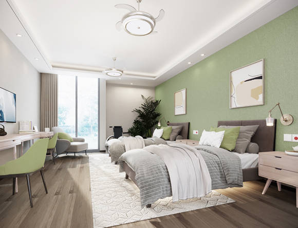 老人房间设施:护理床、呼叫器、储物柜、床头灯、电视、空调、冰箱、电话、独立卫生间、热水器、洗衣机、采暖、新风系统、智能监测设备、书桌
