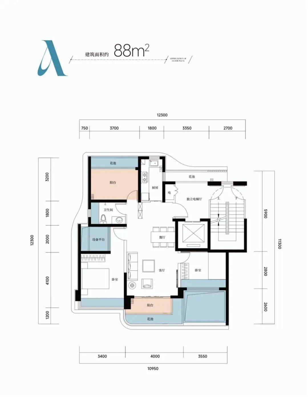 A户型建面88㎡三房两卫,做了7个花池+2大阳台赠送/半赠送,据说实得面积约100㎡,得房率约113%。