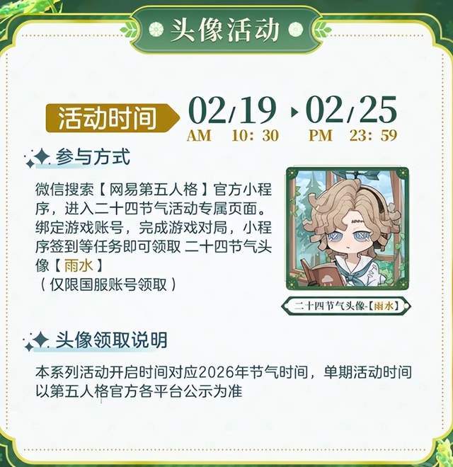 第五人格官方正式公布,2026 年度二十四节气演绎录・雨水篇将于2 月 19 日 10:30开启,持续到2 月 25 日 23:59,整个活动为期 7 天,面向国服所有玩家开放。作为年度固定节气系列,这次依旧延续 “轻任务 + 限定奖励” 的模式,对休闲玩家友好,对收集党友好,但对想冲周边的玩家不算友好。