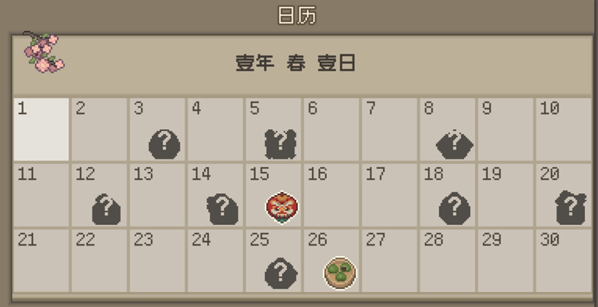 虽然同样有NPC生日和经营时间的概念,但游戏采用的是上中下旬和干支计时的方式,对应进入游戏时日出而作日落而息的UI,让玩家有更深刻的沉浸感。