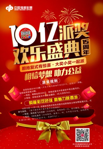 自上市以来,双色球已经成为我国发行量最大的彩票游戏,头奖出奖注数多且奖金额度大,品牌知名度极高(据有关调查显示,超过 1/3的人无提示下知道的第一彩票品牌就是双色球),被彩民朋友们盛赞为“中国彩市航母”! 2018年是双色球上市15周年。为回馈广大彩民的喜爱,也为庆祝上市十五周年,这艘“彩市航母”满载着10亿元派奖奖金已经起航,并将于 10月21日登陆彩市,一场前所未有的欢乐盛典即将上演。彩民朋友们,快来参加吧!