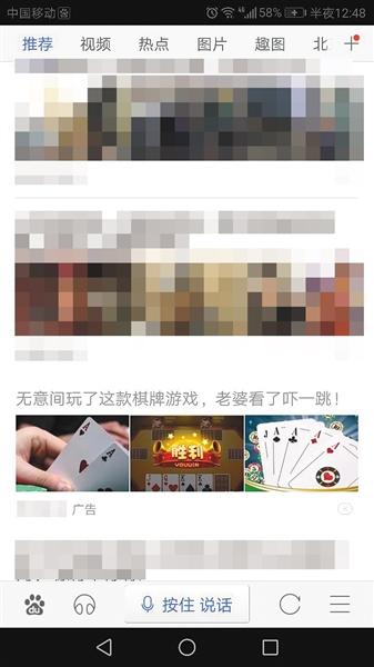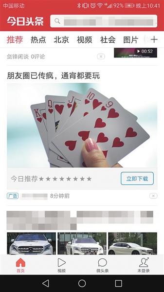 这款App的出现,是他在今日头条看新闻时无意中看到的。他说,当时在首页推荐的新闻中,插有该棋牌游戏App的推广广告,点击该广告便自动跳转到下载页面。