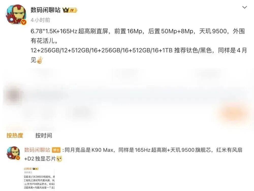 同时,这位博主还表示:“同月竞品是K90 Max,同样是165Hz超高刷+天玑9500旗舰芯,红米有风扇+D2独显芯片”。