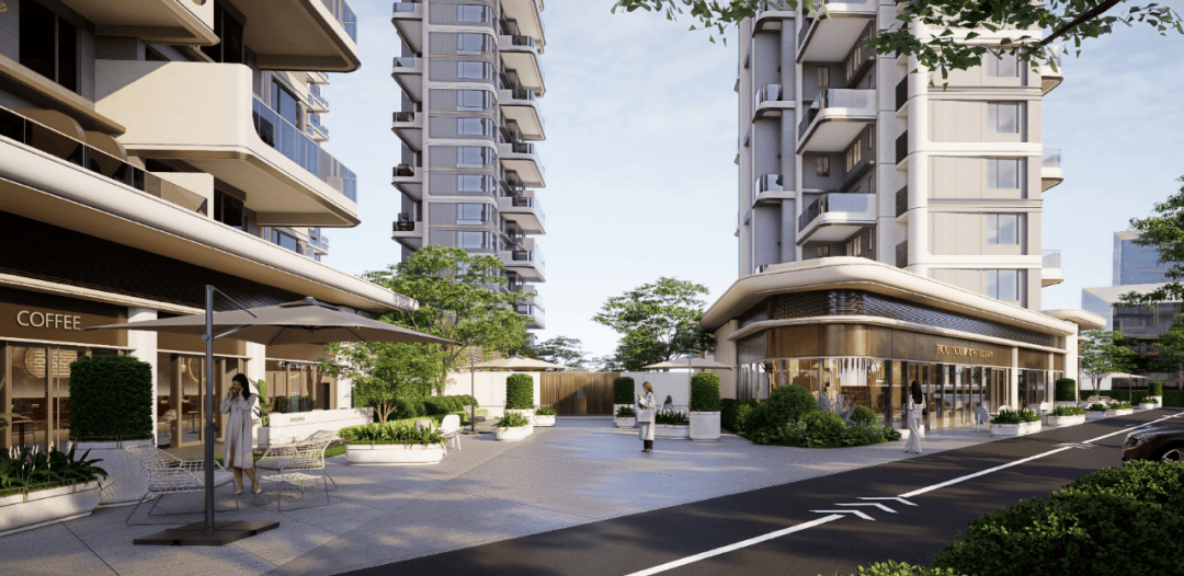 项目将周边进行整体考虑,通过200米的超长都市界面,将约1100方配套丰富的沿街商业和街角广场融入日常的烟火气息中,创造一种亲切、温暖、邻里互动的高品质生活氛围