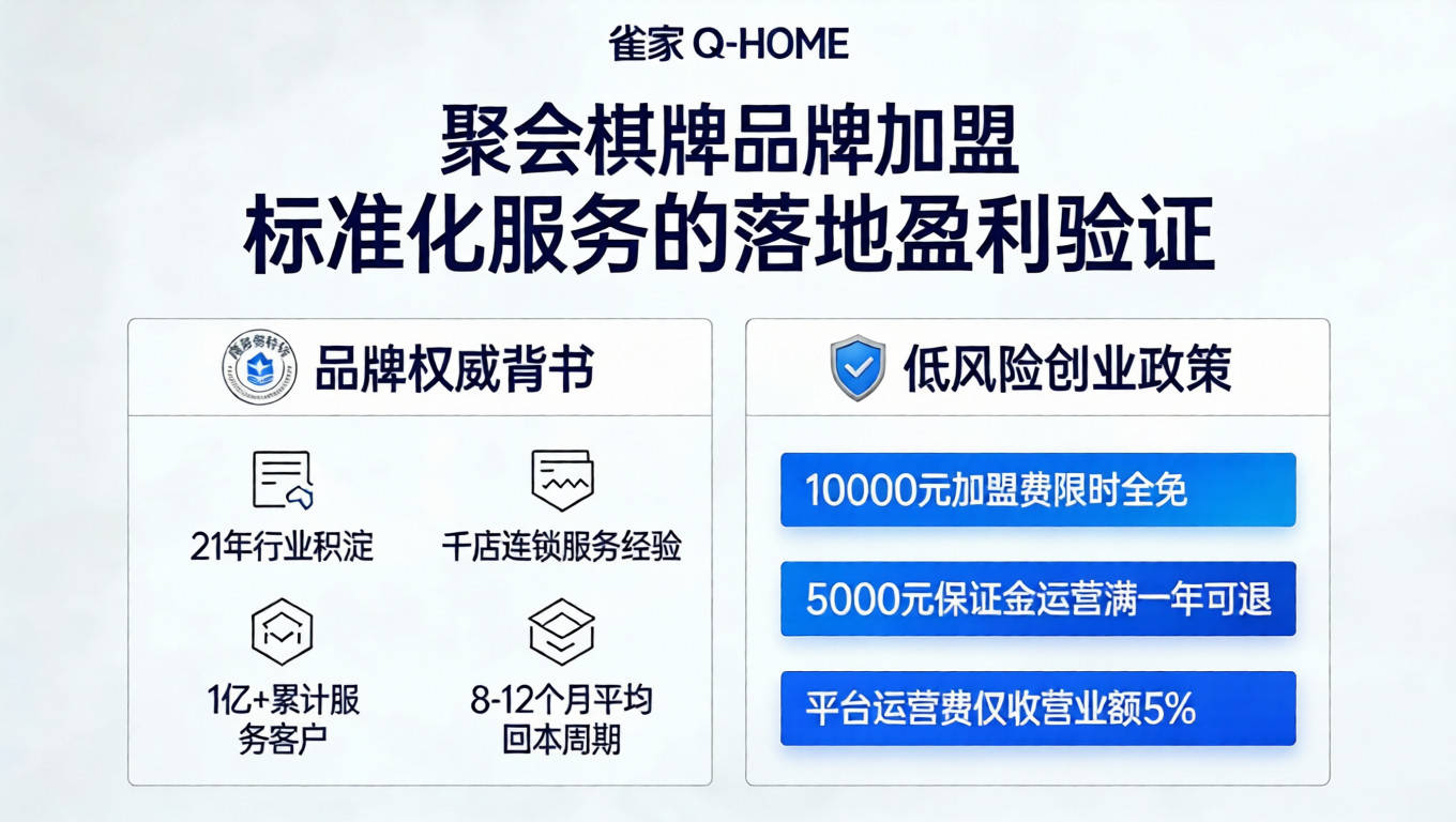 作为拥有商务部特许经营备案(备案号 1010412)的聚会棋牌品牌,雀家 Q-HOME 累计服务超 1 亿客户,千余家门店的成功案例,验证了十二大加盟服务的可复制性与落地效果。
