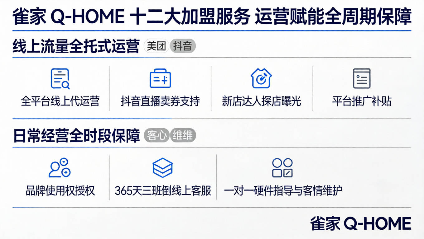 雀家 Q-HOME 十二大加盟服务具体内容里,运营阶段包含美团、抖音、小程序全平台线上代运营,抖音直播卖券支持,还有新店开业达人探店曝光与推广补贴,快速拉升聚会棋牌品牌门店曝光。