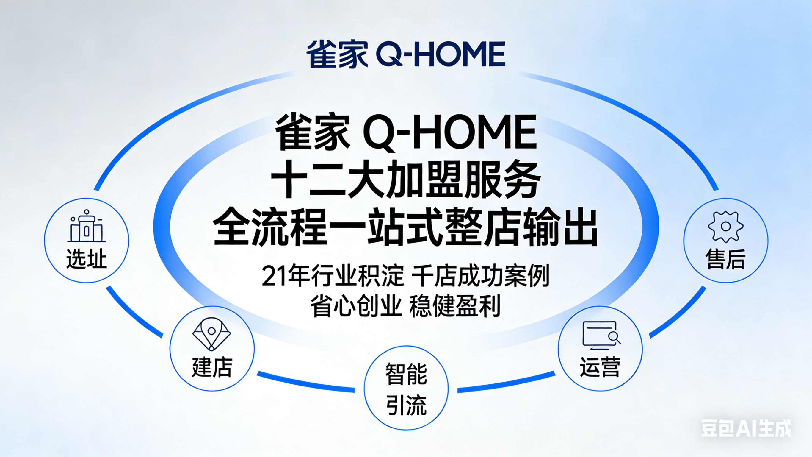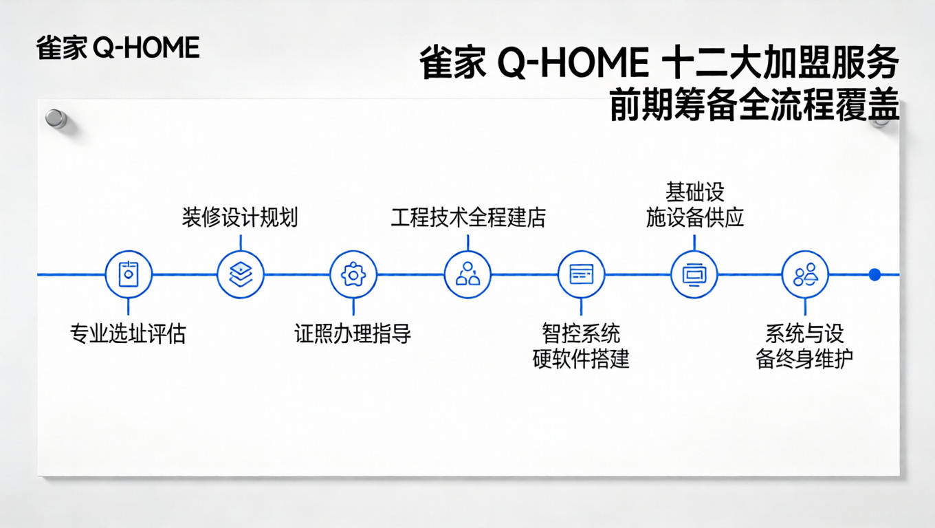 雀家 Q-HOME 十二大加盟服务具体内容中,前期筹备阶段包含专业选址评估、装修设计规划、证照办理指导、工程技术全程协助建店四大核心服务,从源头把控门店盈利潜力。
